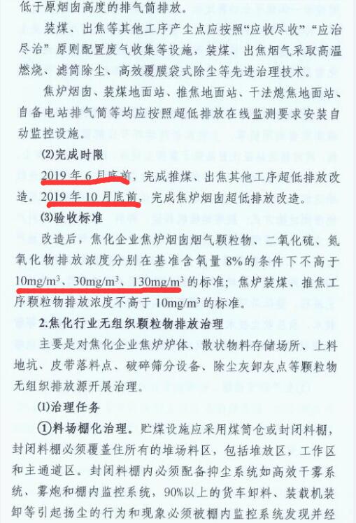 1、2019年6月底前,完成推焦、出焦其他工序的超低排放改造;2019年10月底前,完成焦爐煙囪的超低排放改造。