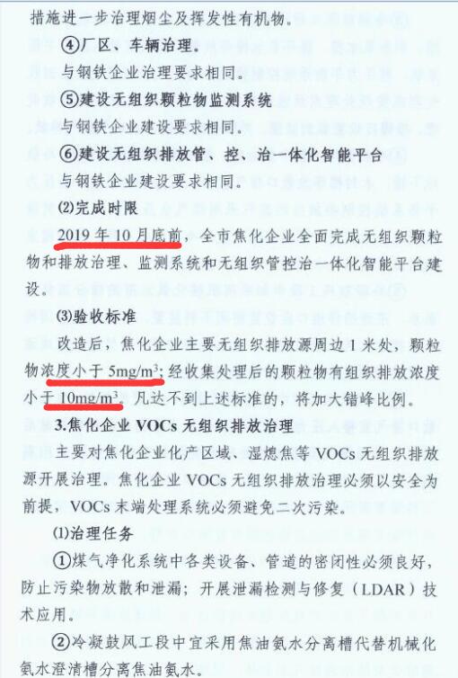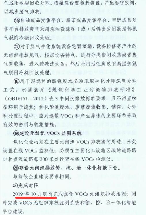 2、2019年10月底前,全市焦化企業全面完成無組織排放治理和監測、無組織排放管、控、治一體化智能平臺建設。