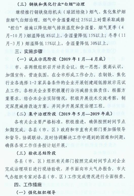 1、2019年6月底前,完成煉鐵、煉鋼等工序的超低排放改造;2019年10月底前,完成燒結機頭(球團焙燒)的超低排放改造。