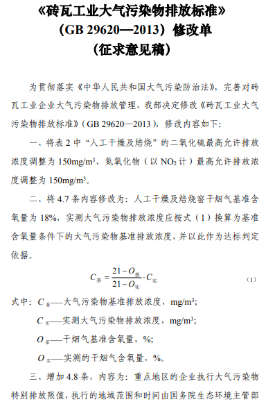 磚瓦工業(yè)大氣污染物排放標(biāo)準(zhǔn)修改單(征求意見(jiàn)稿)