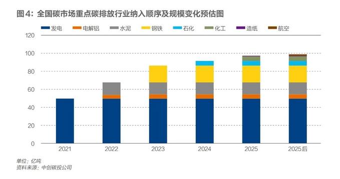 在碳市場涵蓋的范圍方面,未來以怎樣的節(jié)奏納入更多行業(yè),尚未明確。首個(gè)控排行業(yè)發(fā)電行業(yè)的碳排放總量約為40億噸,若電解鋁、水泥、鋼鐵、化工、造紙、石化、航空等七大高耗能行業(yè)全部納入全國碳市場,碳排放總量預(yù)計(jì)在80億/年噸至100億噸/年之間。