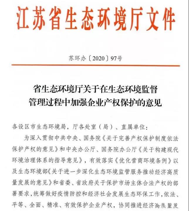 江蘇省生態(tài)環(huán)境廳已發(fā)布了《關于在生態(tài)環(huán)境監(jiān)督管理中加強企業(yè)產(chǎn)權保護的意見》,通過不干擾守法企業(yè)保護企業(yè)產(chǎn)權。免除對標企業(yè),全面禁止環(huán)境保護"一刀切“。