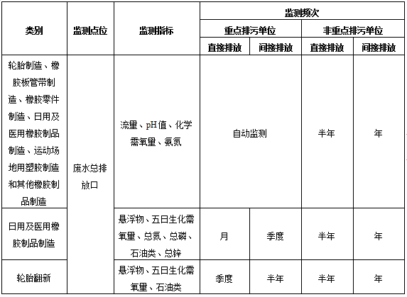 橡膠制品工業(yè)排污單位廢水排放監(jiān)測點(diǎn)位、監(jiān)測指標(biāo)及最低監(jiān)測頻次按照表1執(zhí)行。