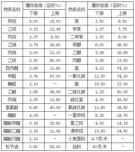 這是由于前者的可燃物濃度不夠,過量空氣的冷卻作用,阻止了火焰的蔓延;而后者則是空氣不足,導致火焰不能蔓延的緣故。常見物質的爆炸極限如下,僅供參考: