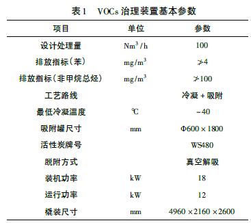 老罐區(qū)苯罐采用江蘇金門(mén)能源裝備有限公司設(shè)計(jì)、制造的JM - VRECS - CD/AD - 100 型VOCs 治理裝置,冷凝+ 吸附集成工藝,裝置主要參數(shù)如表1。