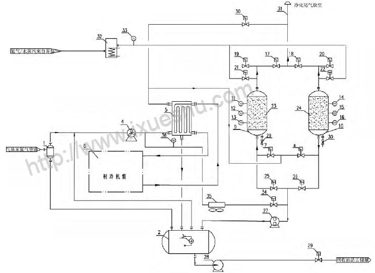 1 - 凝液收集罐; 2 - 氣液分離罐; 3 - 液位變送器; 4 - 風(fēng)機(jī); 5 - 冷箱; 6 - 制冷機(jī)組; 7 - 吸附罐進(jìn)口閥A; 8 - 吸附罐進(jìn)口閥B; 9 - 吸附罐A; 10 - 吸附罐B; 11 - 溫度變送器A; 12 - 溫度變送器B; 13 - 溫度變送器C; 14 - 溫度變送器D; 15 - 溫度變送器E; 16 - 溫度變送器F; 17 - 吸附罐出口閥A; 18- 吸附罐出口閥B; 19 - 吸附罐破真空閥A; 20 - 吸附罐破真空閥B; 21 - 吹掃氣進(jìn)口閥A; 22 - 吹掃氣進(jìn)口閥B; 23 - 吸附劑床層A; 24 - 吸附劑床層B; 25 - 真空脫附閥A; 26 - 真空脫附閥B; 27 - 真空泵; 28 - 回液泵; 29 - 外輸液流量開(kāi)關(guān)閥; 30 - 緊急放空閥; 31 - 排放筒; 32 - 加熱器; 33 - 熱氣體溫度變送器; 34 - 熱氣體脫附開(kāi)關(guān)閥; 35 - 冷卻器、36 - 冷卻溫度變送器