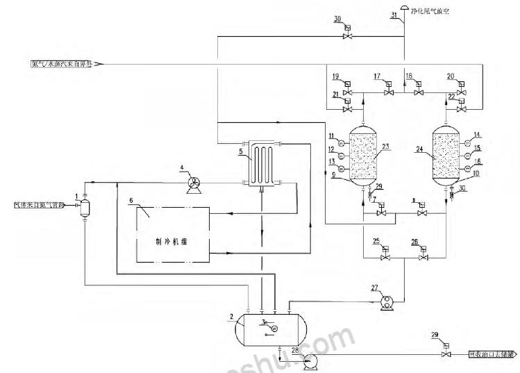 1 - 凝液收集罐; 2 - 氣液分離罐; 3 - 液位變送器; 4 - 風(fēng)機(jī); 5 - 冷箱; 6 - 制冷機(jī)組; 7 - 吸附罐進(jìn)口閥A; 8 - 吸附罐進(jìn)口閥B; 9 - 吸附罐A; 10 - 吸附罐B; 11 - 溫度變送器A; 12 - 溫度變送器B; 13 - 溫度變送器C; 14 - 溫度變送器D; 15 - 溫度變送器E; 16 - 溫度變送器F; 17 - 吸附罐出口閥A; 18- 吸附罐出口閥B; 19 - 吸附罐破真空閥A; 20 - 吸附罐破真空閥B; 21 - 吹掃氣進(jìn)口閥A; 22 - 吹掃氣進(jìn)口閥B; 23 - 吸附劑床層A; 24 - 吸附劑床層B; 25 - 真空脫附閥A; 26 - 真空脫附閥B; 27 - 真空泵; 28 - 回液泵; 29 - 外輸液流量開(kāi)關(guān)閥;30 - 緊急放空閥; 31 - 排放筒
