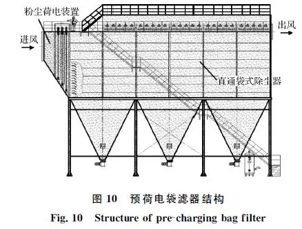針對轉(zhuǎn)爐二次煙氣的排放特征,中鋼集團(tuán)天澄環(huán)保科技股份有限公司開發(fā)了預(yù)荷電袋濾器除塵技術(shù),將預(yù)荷電和直通式袋式除塵器復(fù)合形成一體化裝置,如圖10所示。粉塵預(yù)荷電后在濾袋表面將形成海綿狀粉餅結(jié)構(gòu),能提高凈化效率,同時降低運行阻力。中鋼天澄在鞍鋼煉鋼總廠2×180t轉(zhuǎn)爐二次煙氣凈化項目中建成示范工程,處理風(fēng)量2×60萬m3/h。2014年12月正式投運,截止目前持續(xù)穩(wěn)定,運行可靠,顆粒物排放質(zhì)量濃度低于10mg/m3,技術(shù)性能指標(biāo)達(dá)到超低排放,運行阻力為700~1 000Pa,低于傳統(tǒng)袋式除塵器。目前,在日照鋼鐵、新余鋼鐵、正大特鋼、唐鋼青龍、柳鋼等得到推廣應(yīng)用。