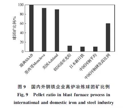 噸球團(tuán)礦的SO2和NOx排放量僅為燒結(jié)礦的約1/2和1/3,提高高爐入爐原料中球團(tuán)礦比例,有利于實現(xiàn)鋼鐵行業(yè)硫硝源頭減排。目前,國內(nèi)外鋼鐵企業(yè)高爐冶煉球團(tuán)礦比例如圖9所示。歐美國家的高爐球團(tuán)礦比例普遍在90%以上,瑞典SSAB廠為100%全球團(tuán)冶煉,墨西哥Monclova廠為93%,美國Ashland廠為90%。亞洲國家高爐球團(tuán)礦占比普遍較低:韓國浦項光陽廠為12%,日本新日鐵為10%,中國河鋼集團(tuán)平均為10%,主要是因為球團(tuán)礦的堿度較低(堿度為0.1~0.2)。