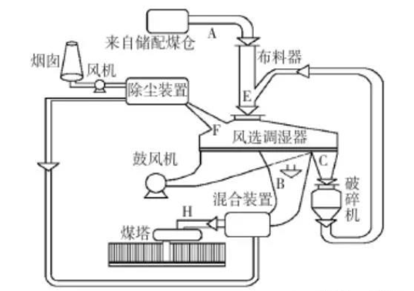 圖3 風(fēng)動(dòng)選擇煤調(diào)濕工藝流程